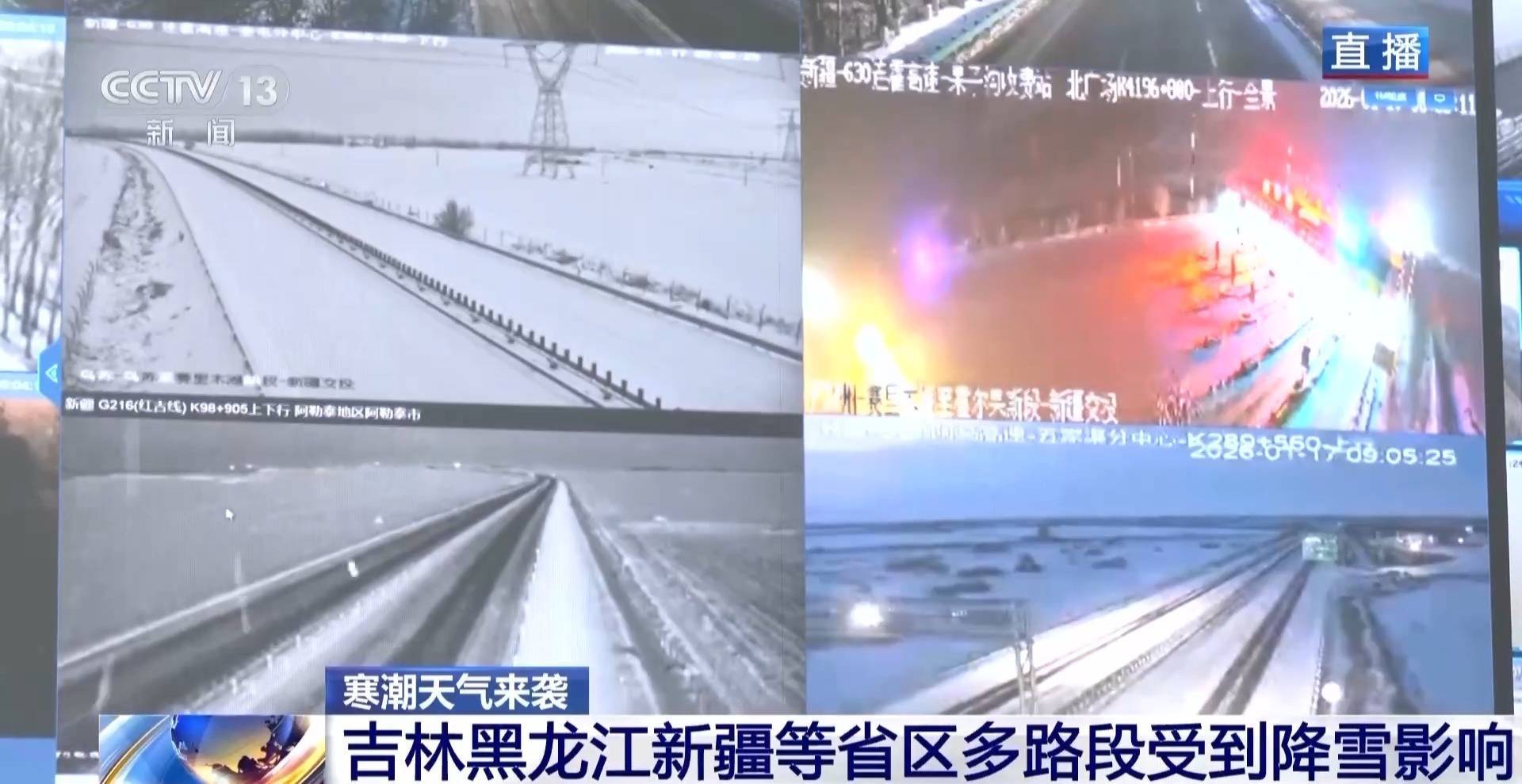 rr总台央视记者 唐颖:我们从交通运输部路网中心了解到,从昨天的17时到今早7时,因降雪及路面结冰,吉林、黑龙江、新疆3省(区)国省干线共有17个路段采取主动封闭管控措施。其中5个路段封闭主线,12个路段关闭收费站。此外,今早因大雾,江苏、浙江、湖南、广东、重庆、四川6省(市)国省干线共有74个路段采取主动封闭管控措施。其中14个路段封闭主线,60个路段关闭收费站。